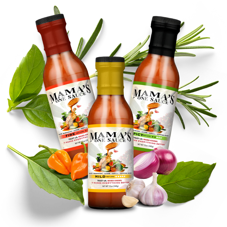 Mama's One Sauce is a sauce and condiment for all foods and comes in three flavors: MILD, SPICY, and FIRE. It is perfect for any dish, including fish, seafood, pasta, vegetables, wraps, and beef. It can be used as a marinade, ingredient-base, dipping sauce, or even on salads -- it goes on anything!